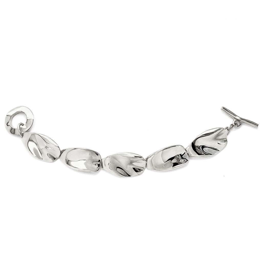 Molten metals form a brilliantly glossy bracelet designed for daily wear. Drawing from the delicate, resilient petals of a flower, she is meticulously handcrafted to capture both fluid motion and light-bending shine for maximum impact.