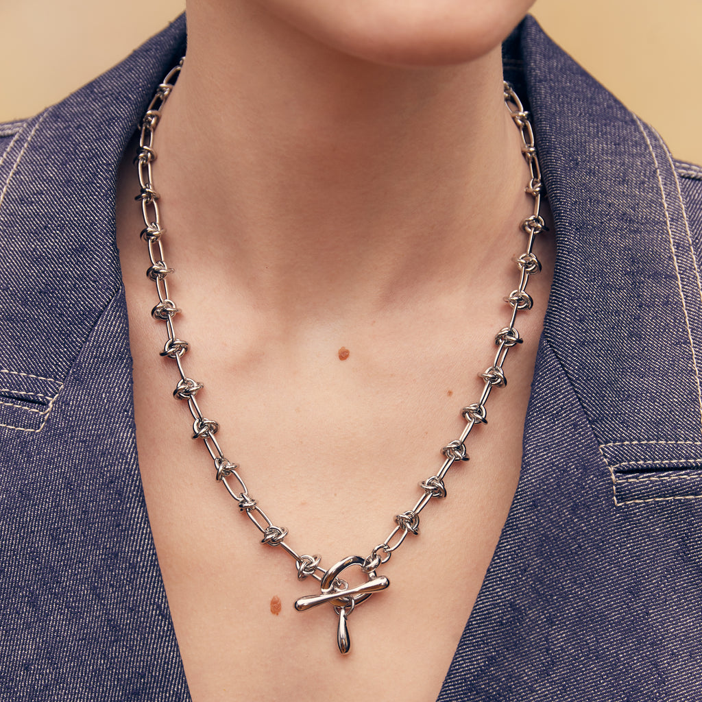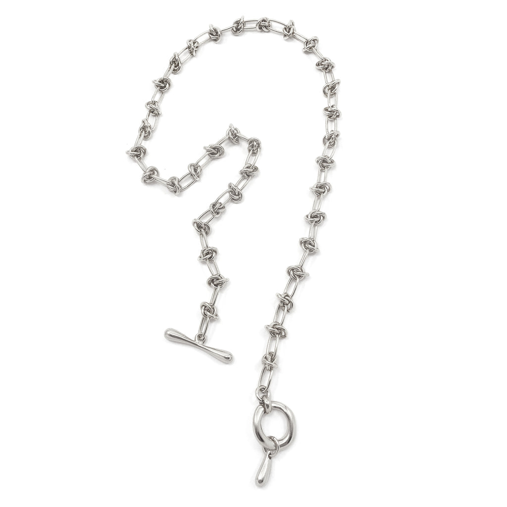 Did we mention we love versatility? Dimensional yet super sleek, the Echo Lariat can be worn at least 3 ways, each with its own pretty statement. Wear as a single chain with the toggle & droplet charm to the front, pulled through and closer to the neck for an elongating linear look, or as a minimal texture-forward chain with the details to the back. This particular knot-style chain is meticulously handcrafted - link-by-link - and accented with our signature droplet charm, adding a touch of soft femininity.
