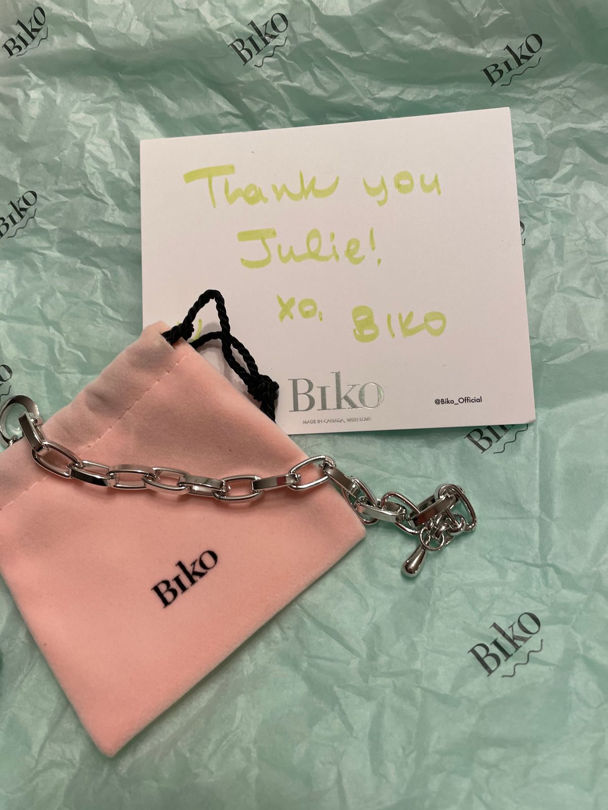 From the moment I ordered and resquested alterations to the delivery with a hand written note : GREAT customer service! I LOVE my bracelet and I am very proud to encourage Biko!