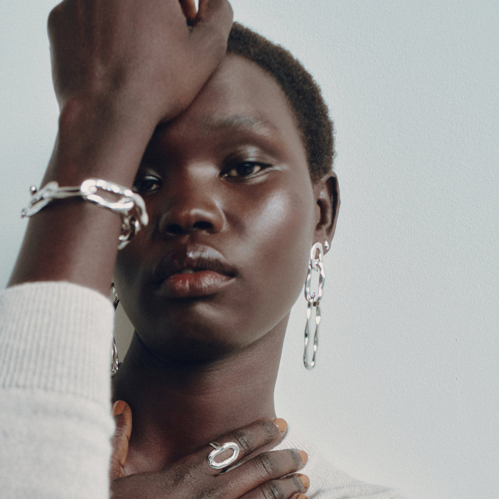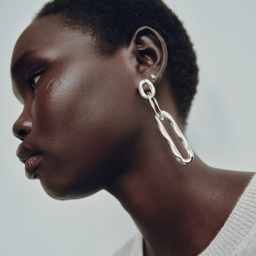 The classic chainlink earring, reimagined. Sculptural, mirror-polished links drip with fluidity, catching the light from every angle. Lightweight and meticulously handcrafted, these dusters move effortlessly with you—designed for maximum shine and impact.