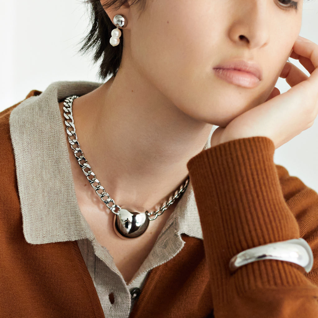 A high-shine sculptural pendant anchors this streamlined statement choker. Complete with a sleek curb chain, this piece is the perfect topper over a turtleneck or with a button-up blouse.