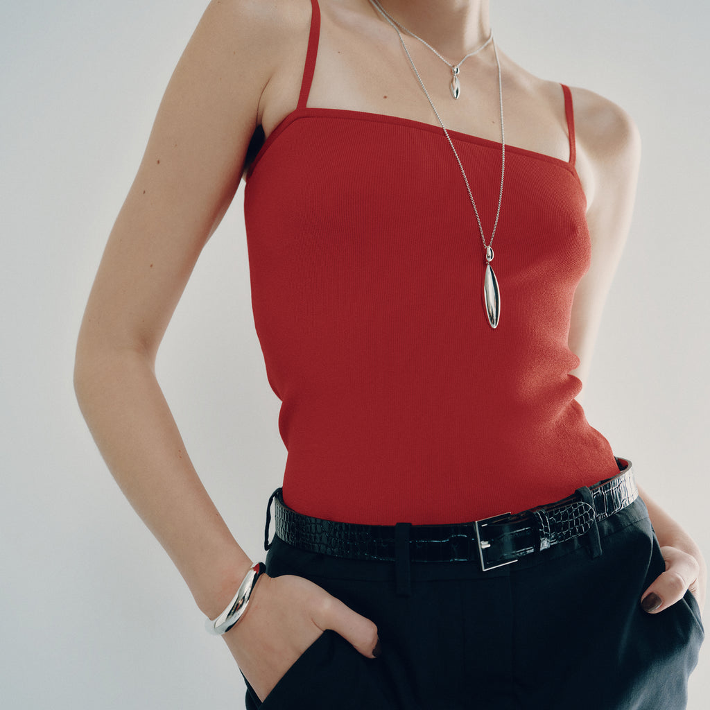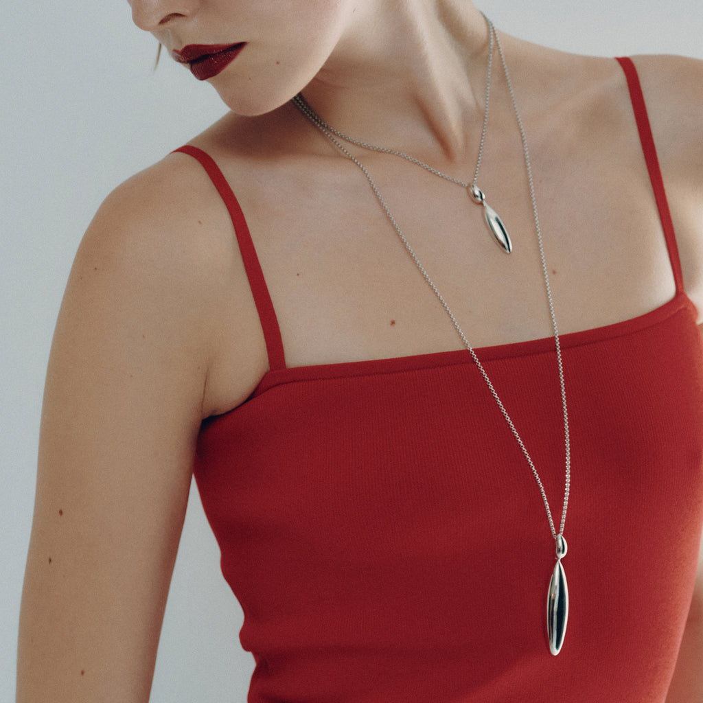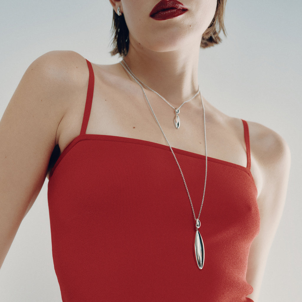 An interlocked duo of glossy pendants, perfectly in sync, hang from a delicate rolo chain. Like a glowing ember, this piece adds a spark to your everyday look. Wear it solo or stack it up—either way, it's just heating up. Also available in Small.