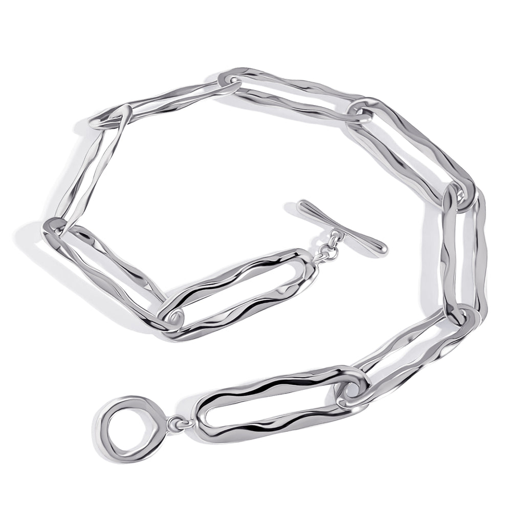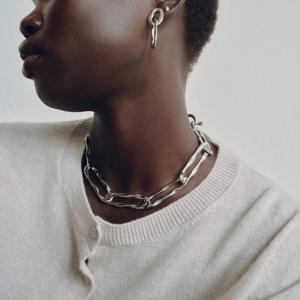 Not your typical chainlink. Oversized, mirror-polished links unite in a wavy drip of structured fluidity. Meticulously handcrafted and assembled link by link, this is the type of piece that becomes your signature. Wear it tucked under a crisp collar for a hint of shine or let it steal the show over a turtleneck or LBD. Complete with our custom wavy toggle and bar.