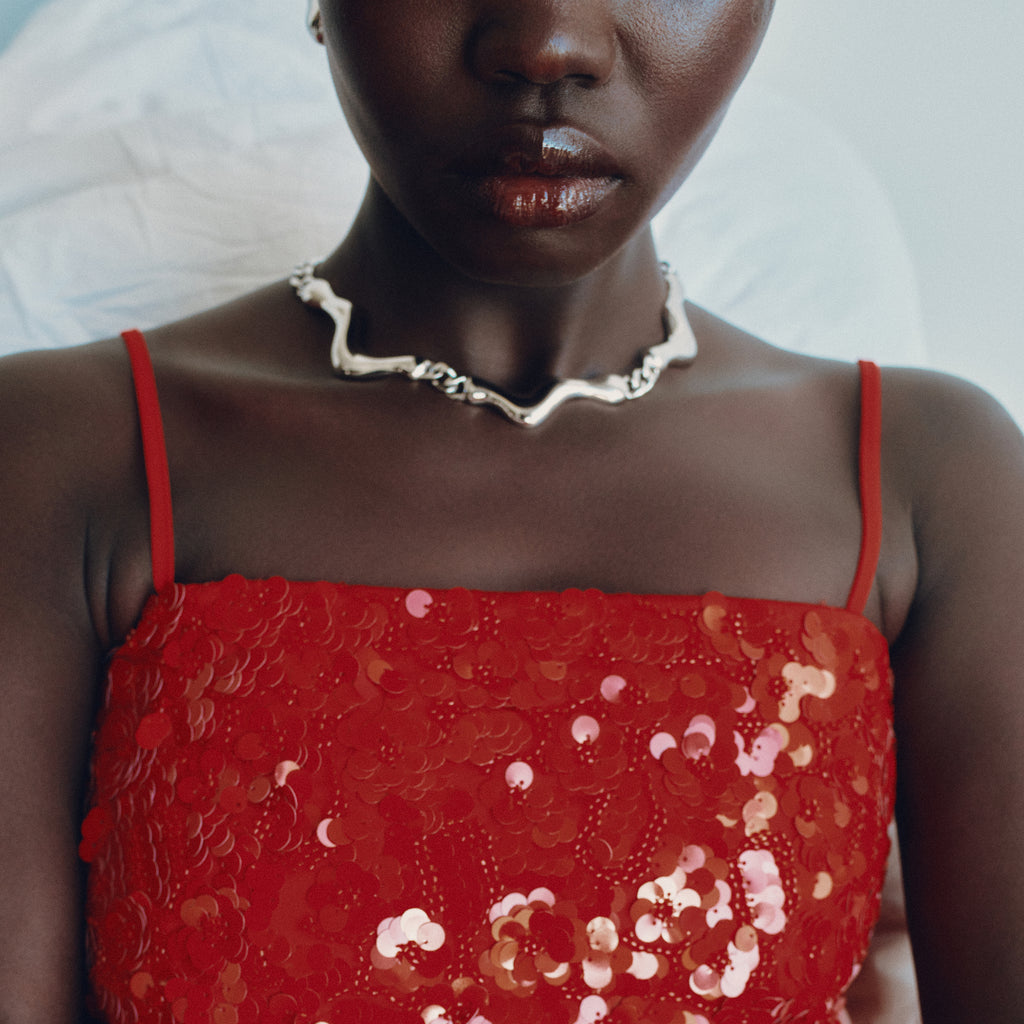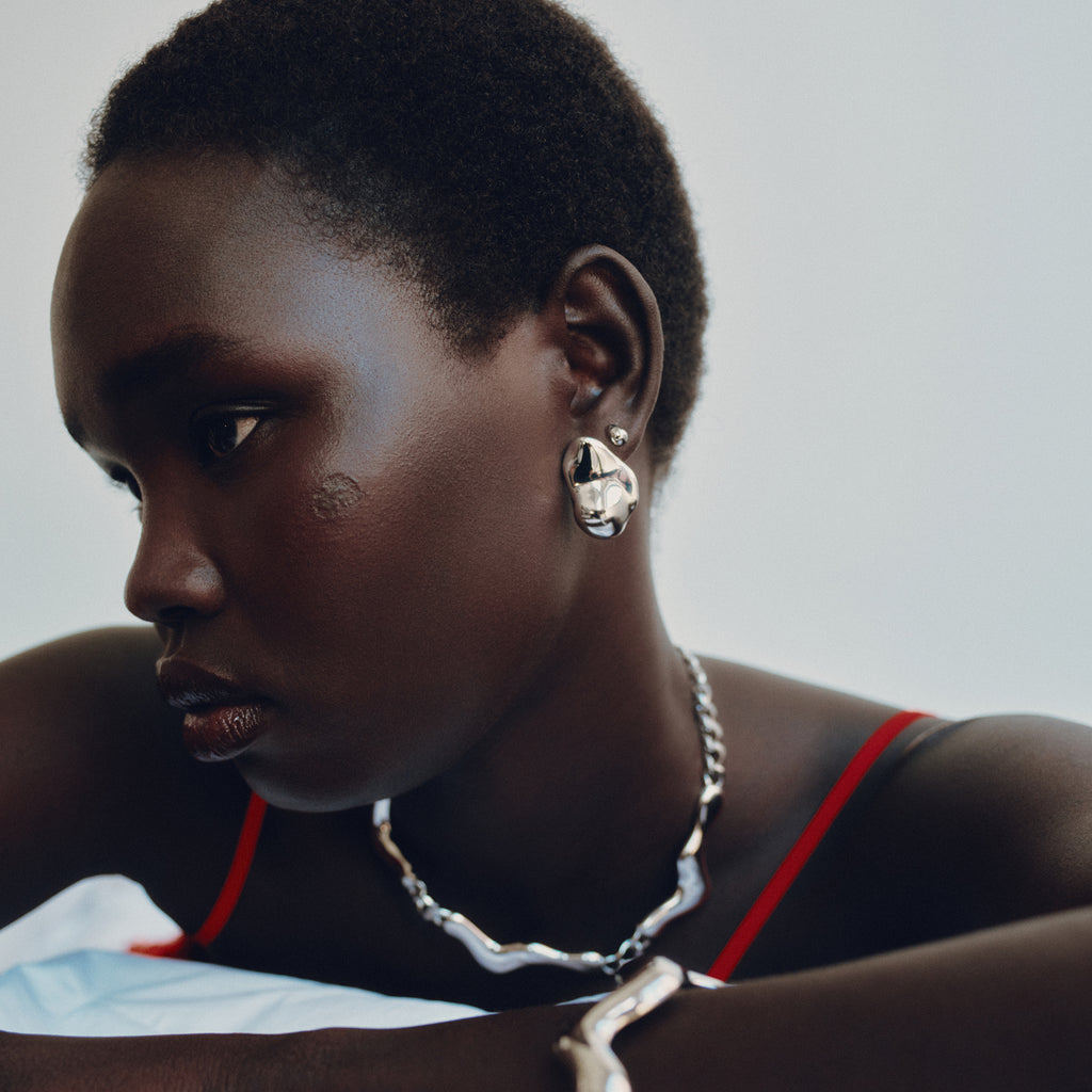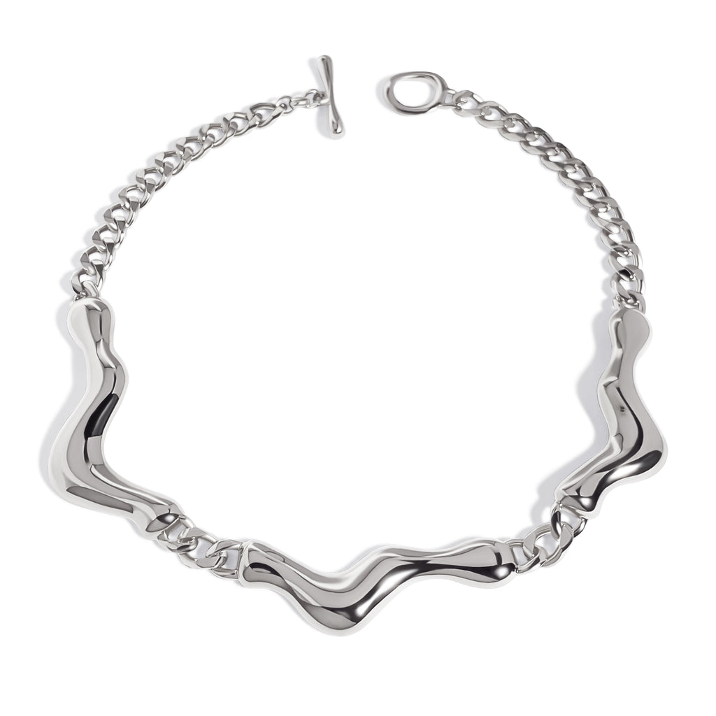A dripping curve of molten metal hugs the neckline just right—modern, minimal, effortlessly cool. Connected by sleek links, each mirror-polished element reflects light with every move. A perfect balance of structure and fluidity, Noa is your go-to for day-to-night shine. T-shirt or little black dress? It just works.