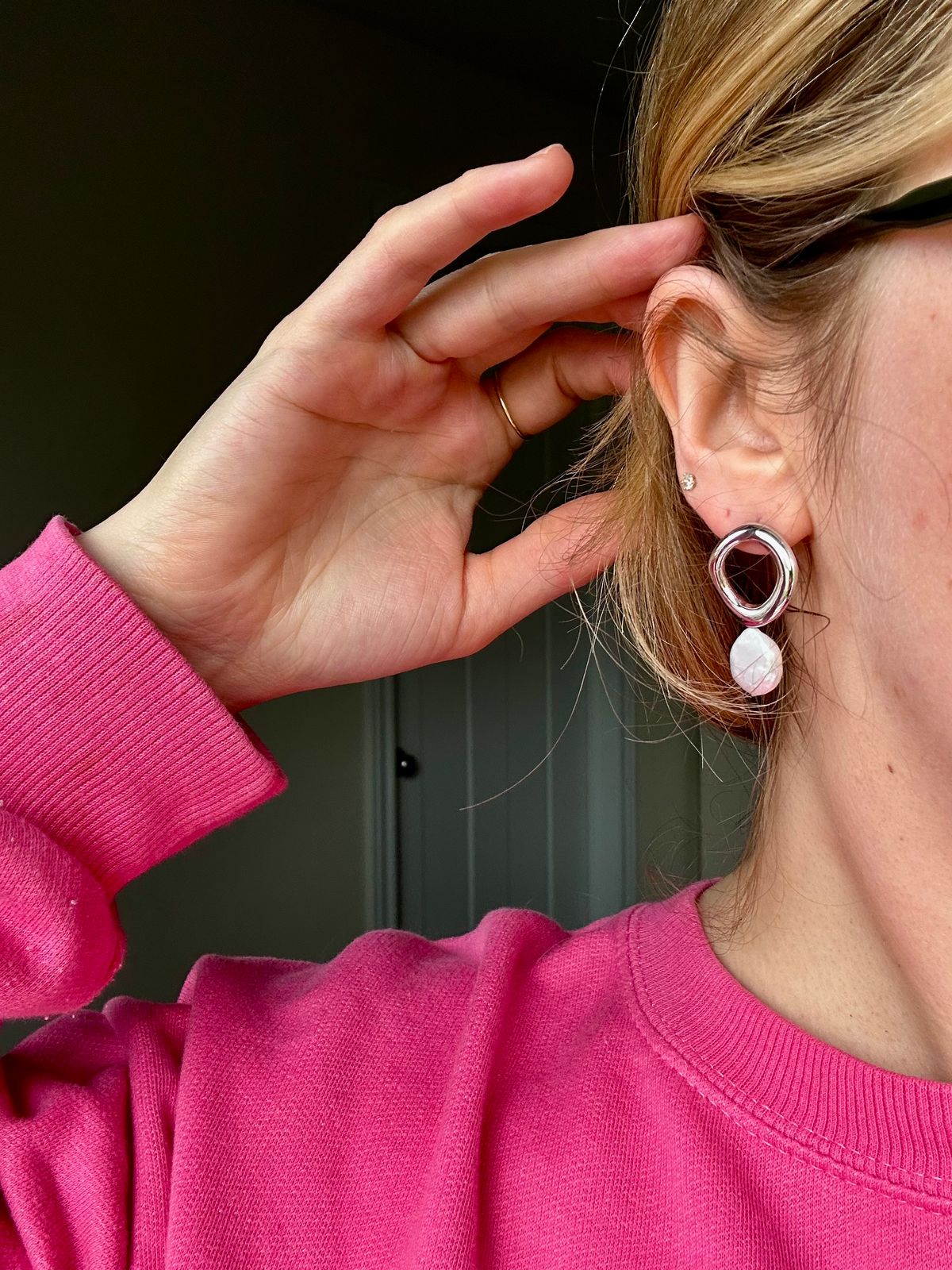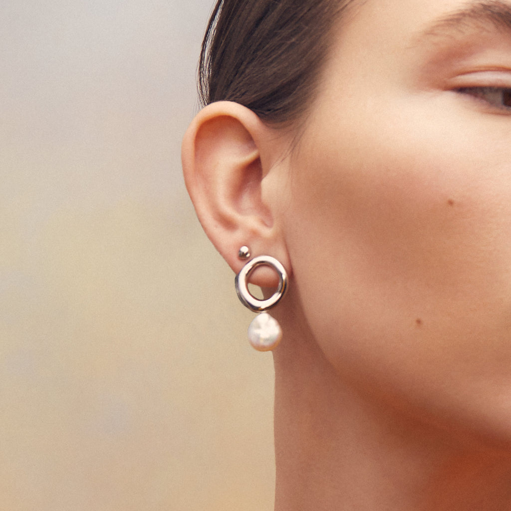 Modern, sleek and curvaceous, with the perfect pop of pearl. The open ring top mimics the playful shape of an air bubble suspended just beneath the surface of the sea, and is complete with a unique baroque freshwater coin pearl. No two pairs are ever exactly alike, making them as unique as you are.
