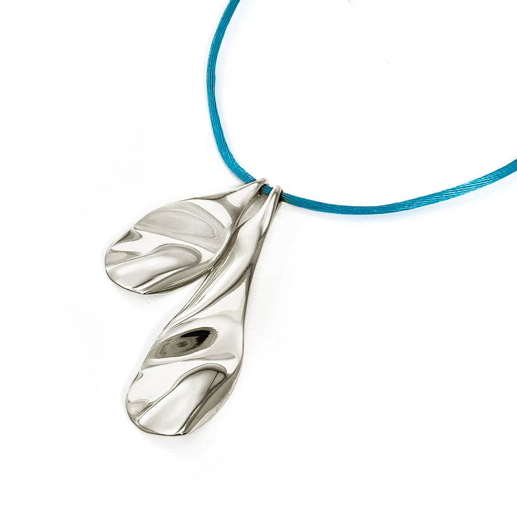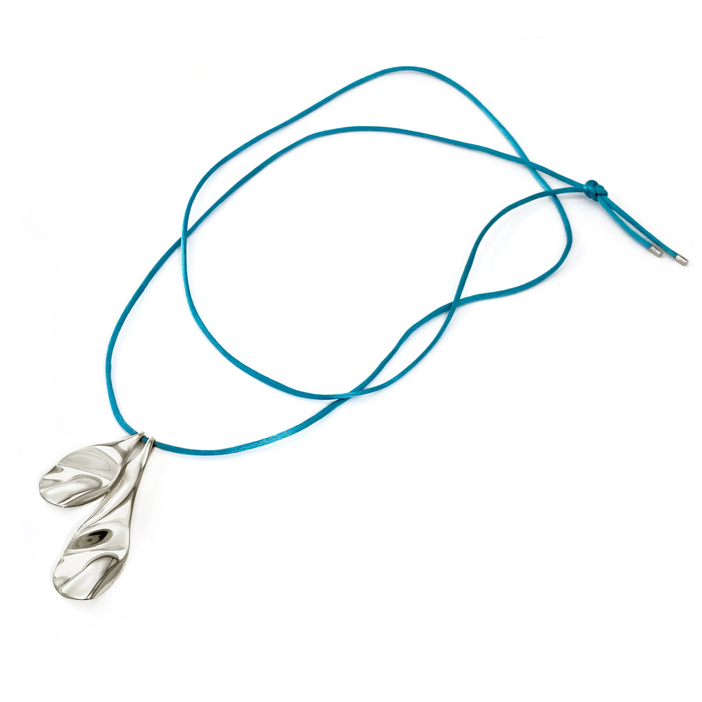 A bright duo of sleek, petal-shaped forms suspend from a satin cord. Each petal is removable, so you can wear with just one as well!. Tie the cord once around the neck long or short, or wrap twice around with a bow tied front and centre. Available in Teal & Black.