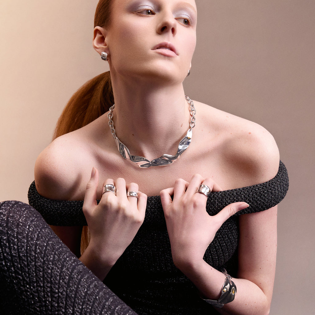 Abstract floral petals melt into a dance of light and shadow, forming a sleek collar silhouette. Equal parts delicate and cool-girl, this day-to-night piece is strong over an everyday basic T, or paired with your fave dress for a special night out. Complete with a chic oval link chain and custom wavy toggle and bar closure.