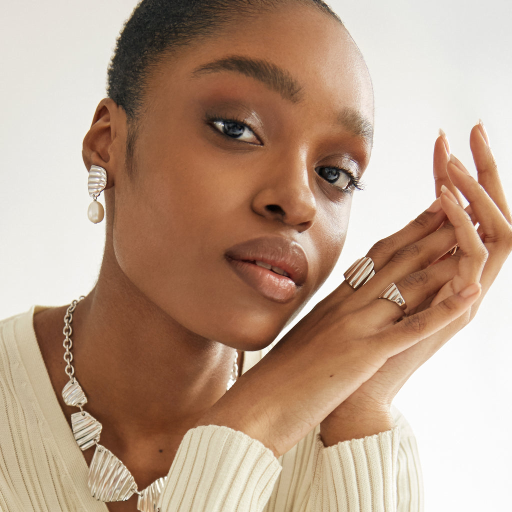 Radiance redefined. An energetic, artful expression of the sun's luminosity, the sleek Soleil Ring is meticulously handcrafted from deconstructed shell findings, delivering light-bending shine for maximum impact. It's organic ripples perfectly curve along the finger for a comfortable, modern silhouette. Cue your new timeless statement ring. Available in Small, Medium & Large.