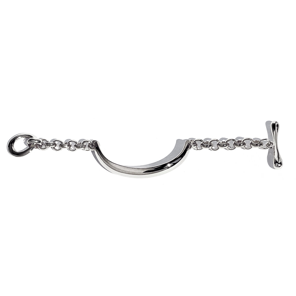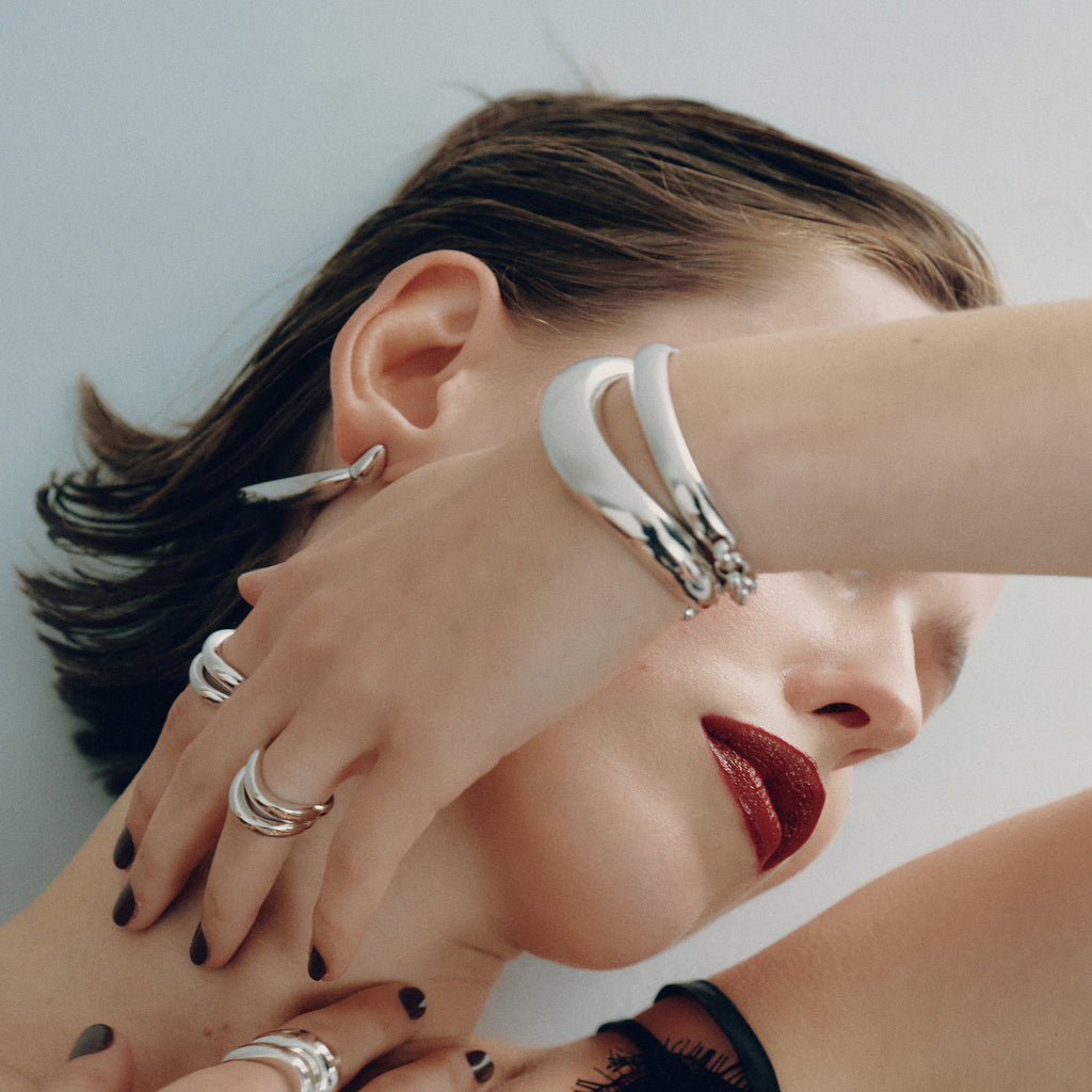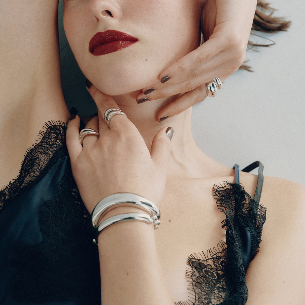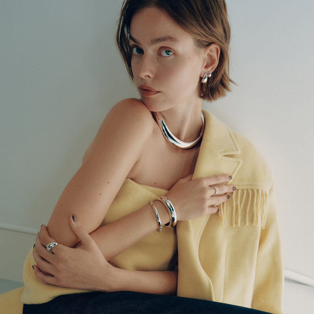 This mirror-polished curve hugs your wrist just right—modern, minimal, and effortlessly chic. The perfect balance of structure and fluidity, finished with a sleek rolo chain and custom wavy toggle and bar closure. Your new go-to for every day.