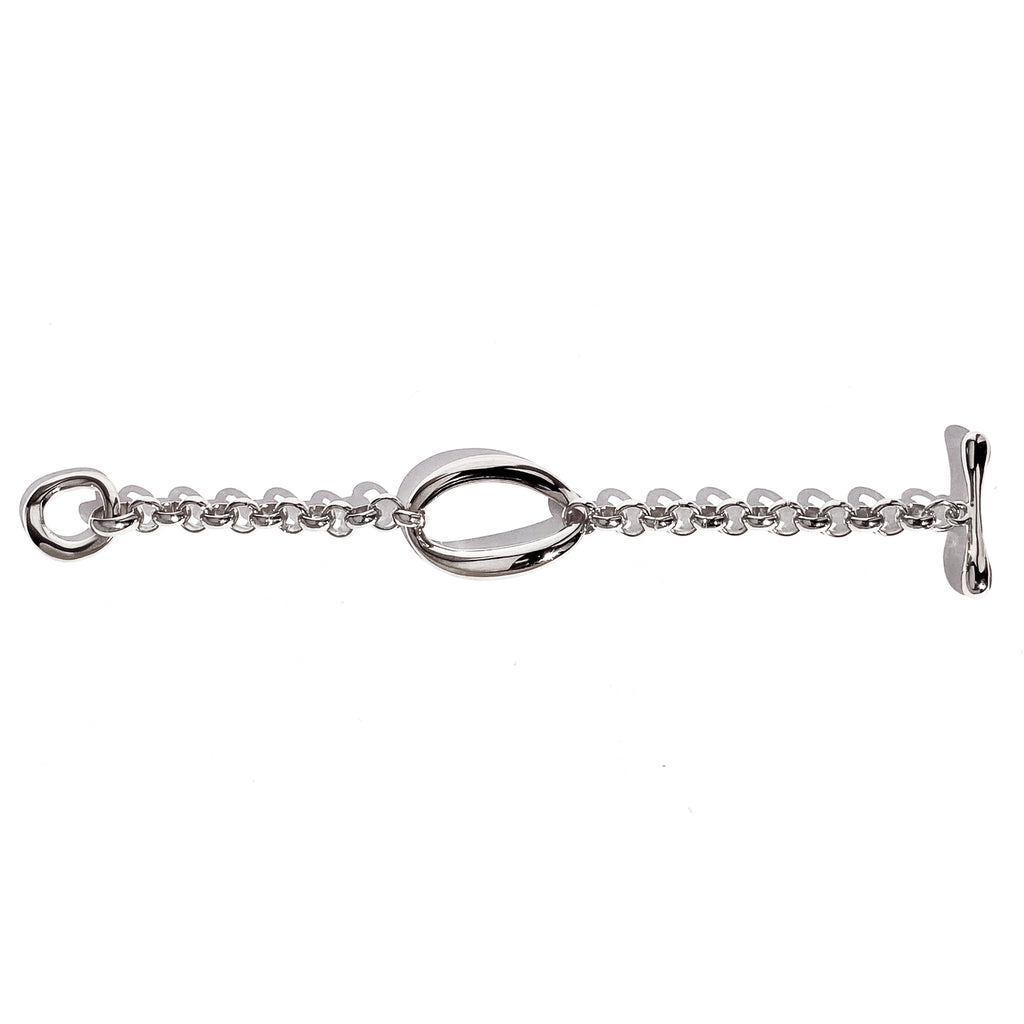 Enter your new everyday bracelet. This sleek rolo link is made complete with our custom curb feature pendant and wavy toggle and bar closure.