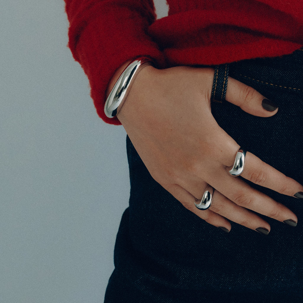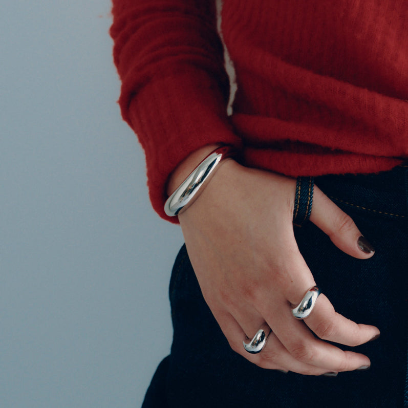 An abstract wave of luminous metal contours your wrist with sleek precision. With its refined silhouette, this cuff is the epitome of comfort and everyday style—wear it solo or stack it up.