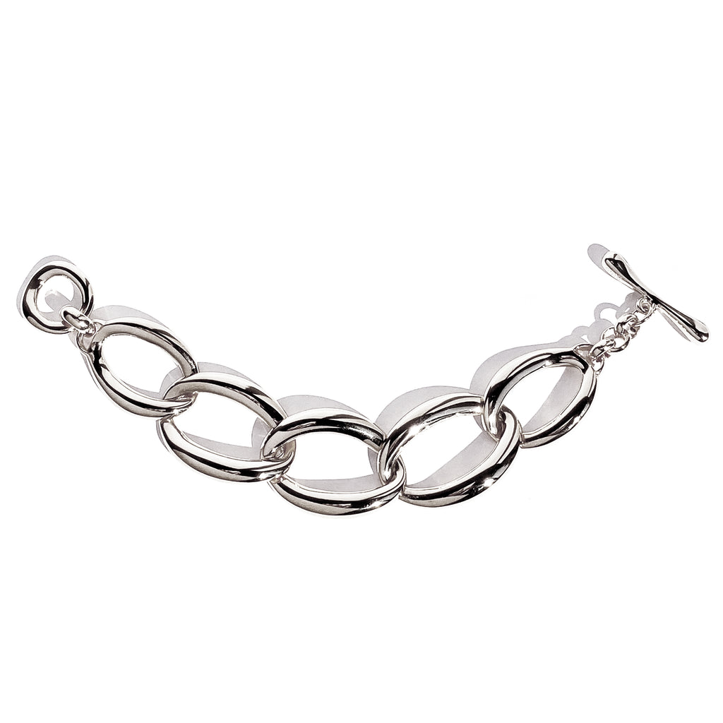 A chic oversized custom curblink bracelet to top off your daily looks. Each component is custom cast, hand-polished and assembled by hand, link-by-link. Finished with our custom wavy toggle and bar closure.