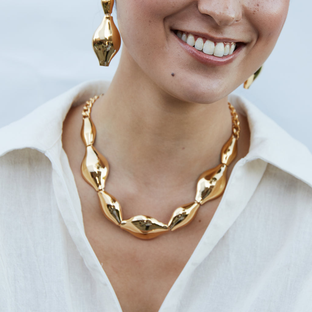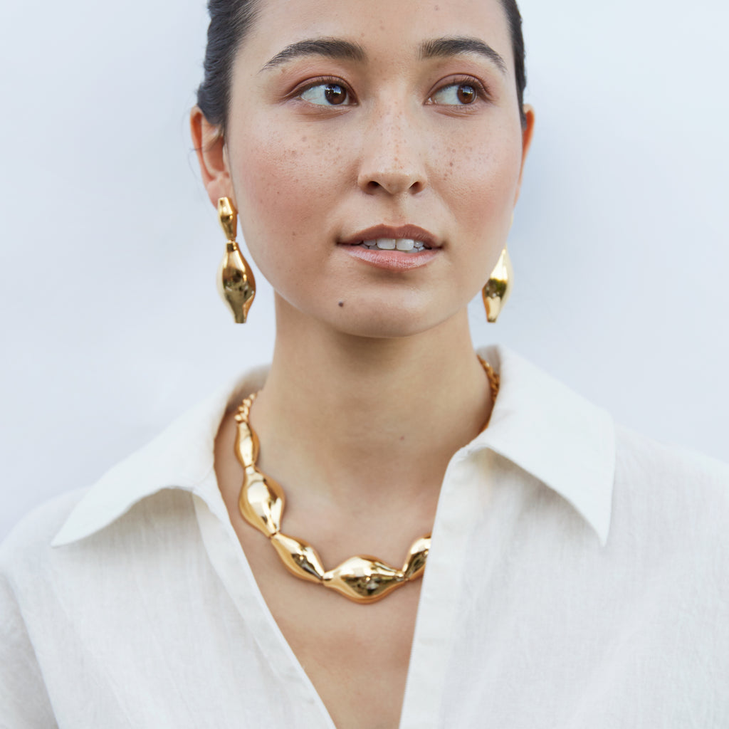 Meet me in the Old World - a sculptural journey awaits. Inspired by the curvaceous forms of ancient amphoras (vase-like vessels that traditionally stored wine & olive oil), the sleek Amphora Collar is meticulously handcrafted to create movement and light-bending shine for maximum impact. She's a timeless, artful statement piece, to be easily paired with a simple T or blouse for everyday, or with your fave dress for a night out. A modern classic for the ages.
