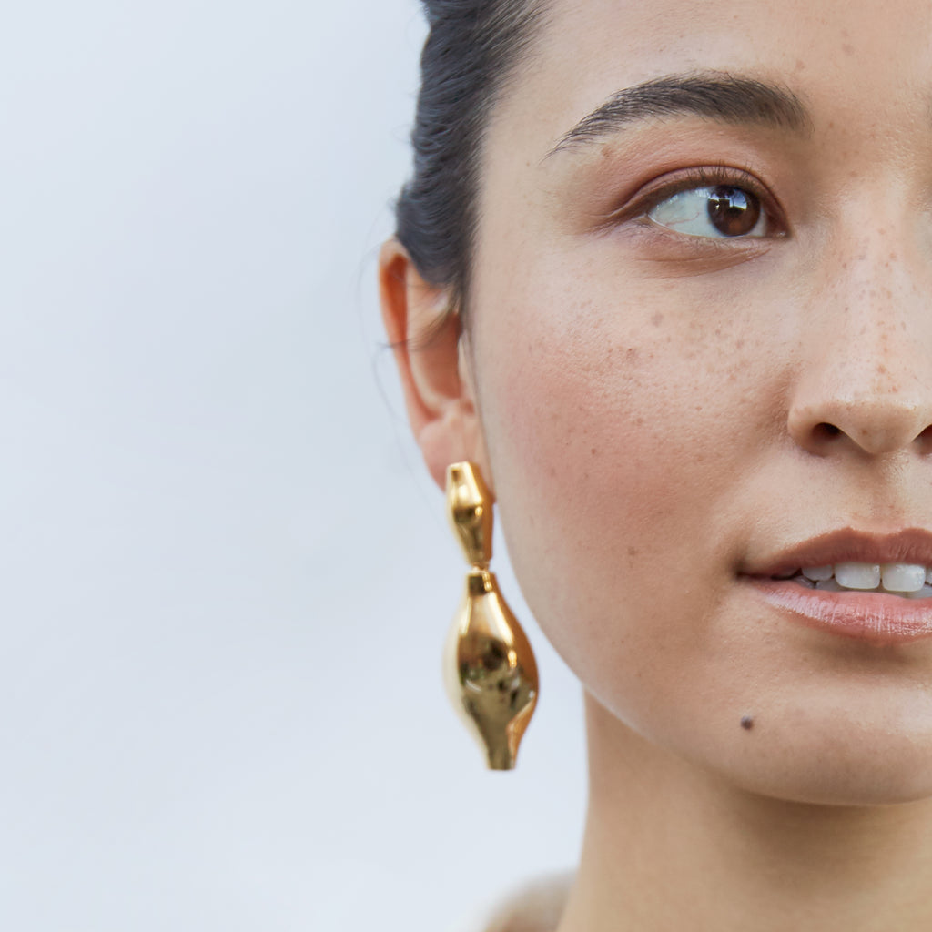 Meet me in the Old World - a sculptural journey awaits. Inspired by the curvaceous forms of ancient amphoras (vase-like vessels that traditionally stored wine & olive oil), the sleek Amphora Statement Drops are meticulously handcrafted to create movement and light-bending shine for maximum impact.