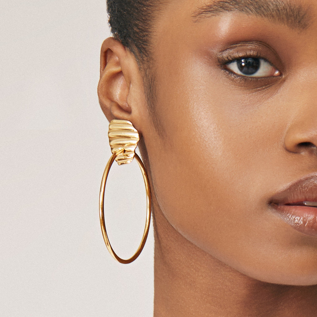 ...Meanwhile, we've stepped it up a notch over here. Big hoop fans rejoice! A sleek, large hoop playfully suspends from a handcrafted rippled earring top, adding standout dimension to your look.