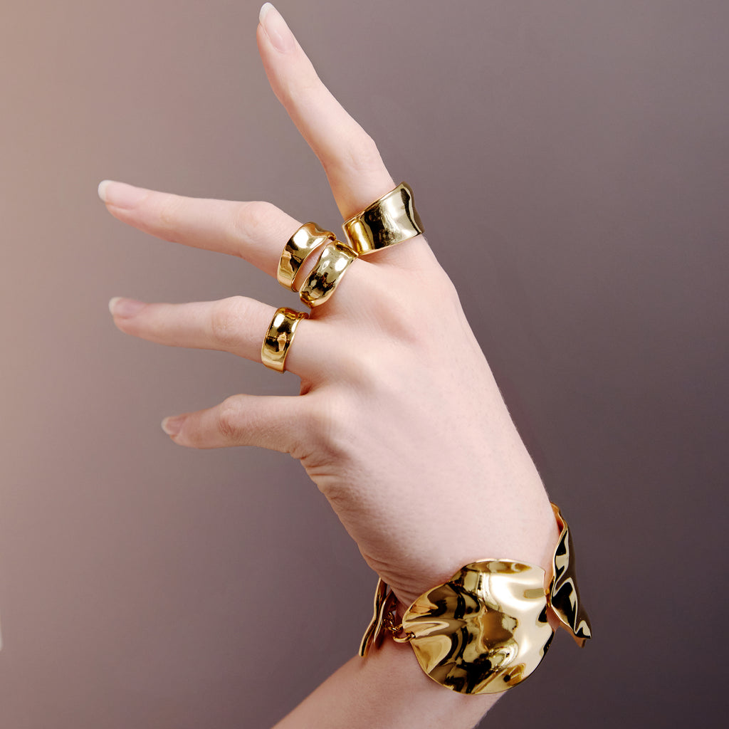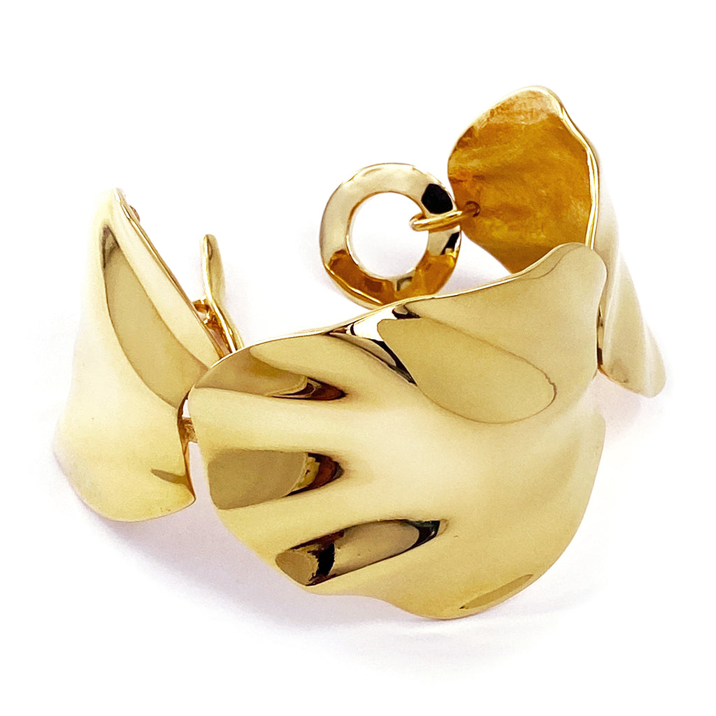 A wearable sculpture of interlocking molten petals, this modern take on florals captures light-bending shine for maximum impact.
