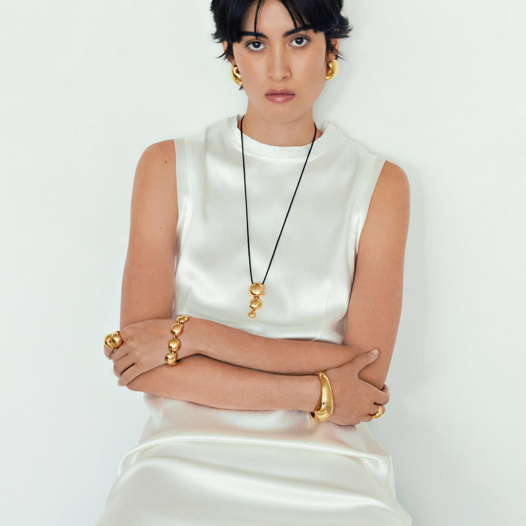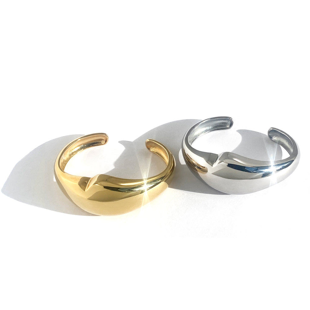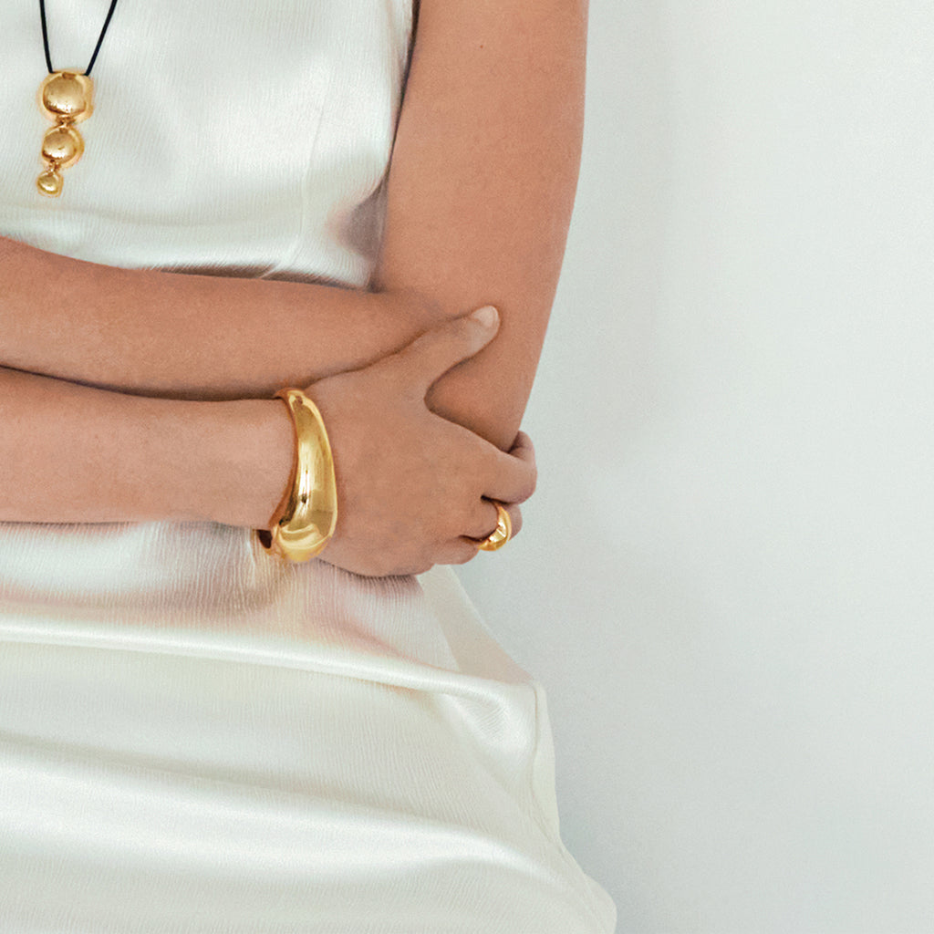 Taking inspiration from the graceful flow of liquid metal as it forms into a timeless, sensuous shape, the statement Colette Cuff brings you on a luminous adventure. A wearable sculpture, she is thoughtfully handcrafted to bend and curve in all the right places. While she radiates worn directly on the wrist, we also love layering her over a fitted long-sleeved shirt. Gently adjustable.