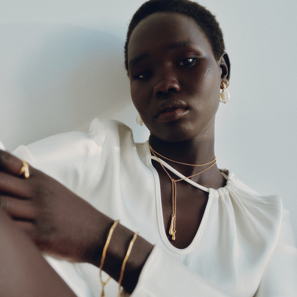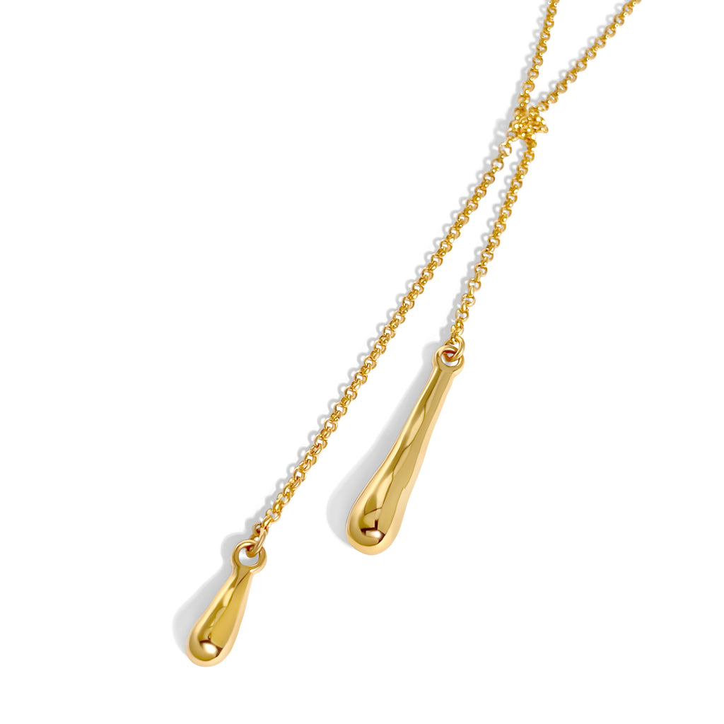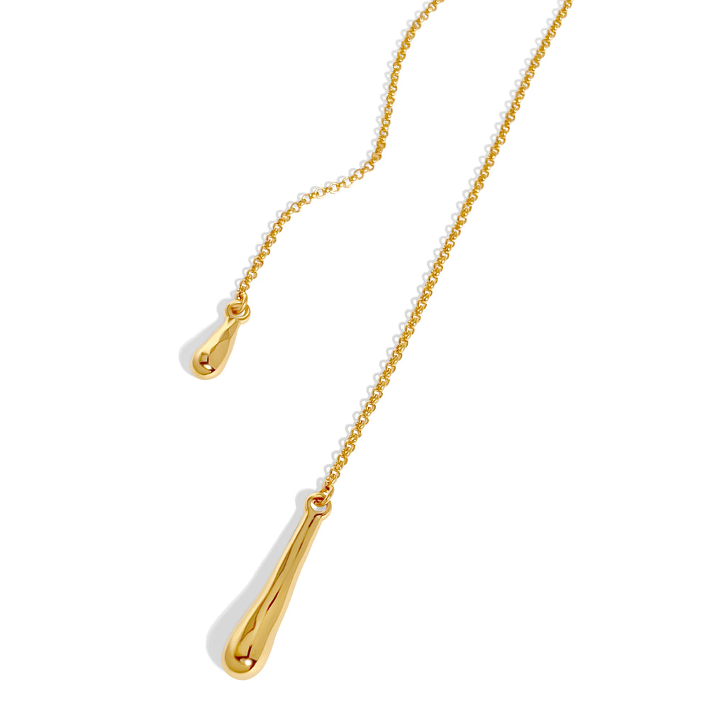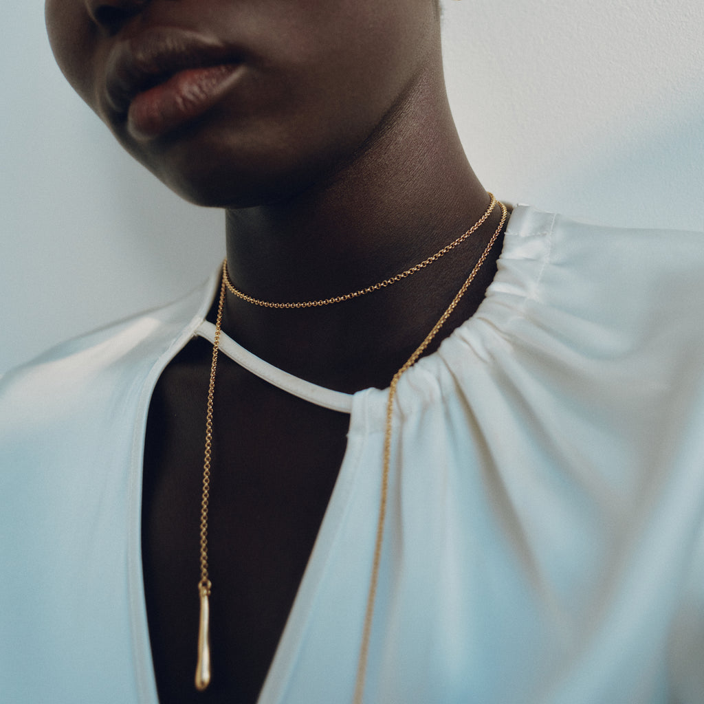 A duo of hand-formed molten droplets cascade from a minimal rolo chain, shifting effortlessly from cool-girl accent to everyday essential. This beauty is the ultimate multi-tasker—wear it long and tied, folded scarf-style for a shorter look, or wrapped once around for a chic choker effect. So many ways to wear, all yours to explore. Also available in gold.