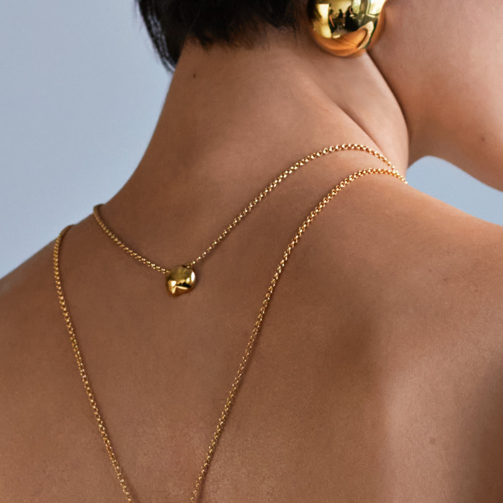 The "mini" of the group, this organic, voluminous pendant works seamlessly as an everyday layering piece. Taking its inspiration from the graceful flow of liquid metal, it is forever playful, effortless and radiant. Available in 3 sizes.
