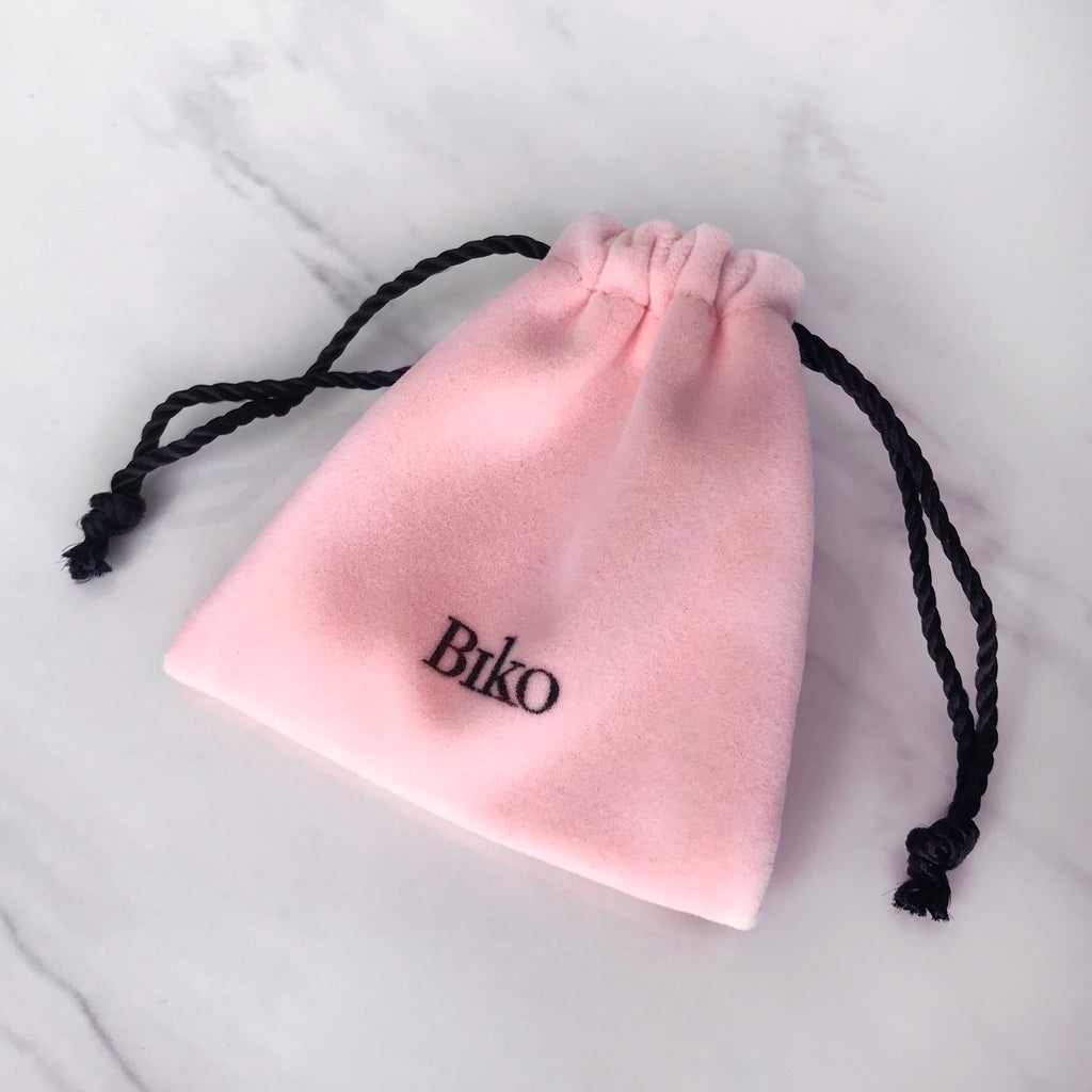 For increased longevity, keep your jewelry clean and dry using a soft cloth. Avoid wearing your jewelry in the shower or during exercise, and wear after applying perfume or hairspray. Protect your piece from rain and humidity. When not wearing, be sure to store inside a jewelry box or soft jewelry pouch, such as the pink branded BIKO pouch provided.
