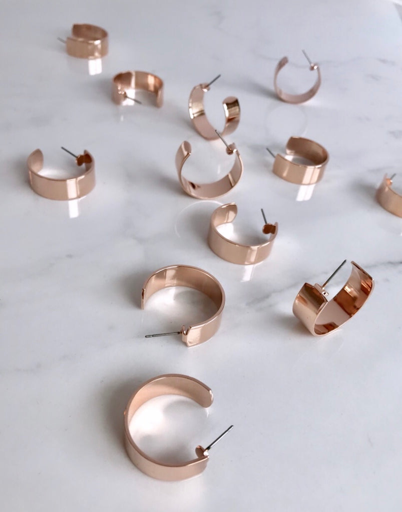 A classic and stylish design. Love the width of the hoops and they are beautiful in the rose gold finish. I also like the slightly chunky design. THe earrings are also light weight - I barely feel them on.