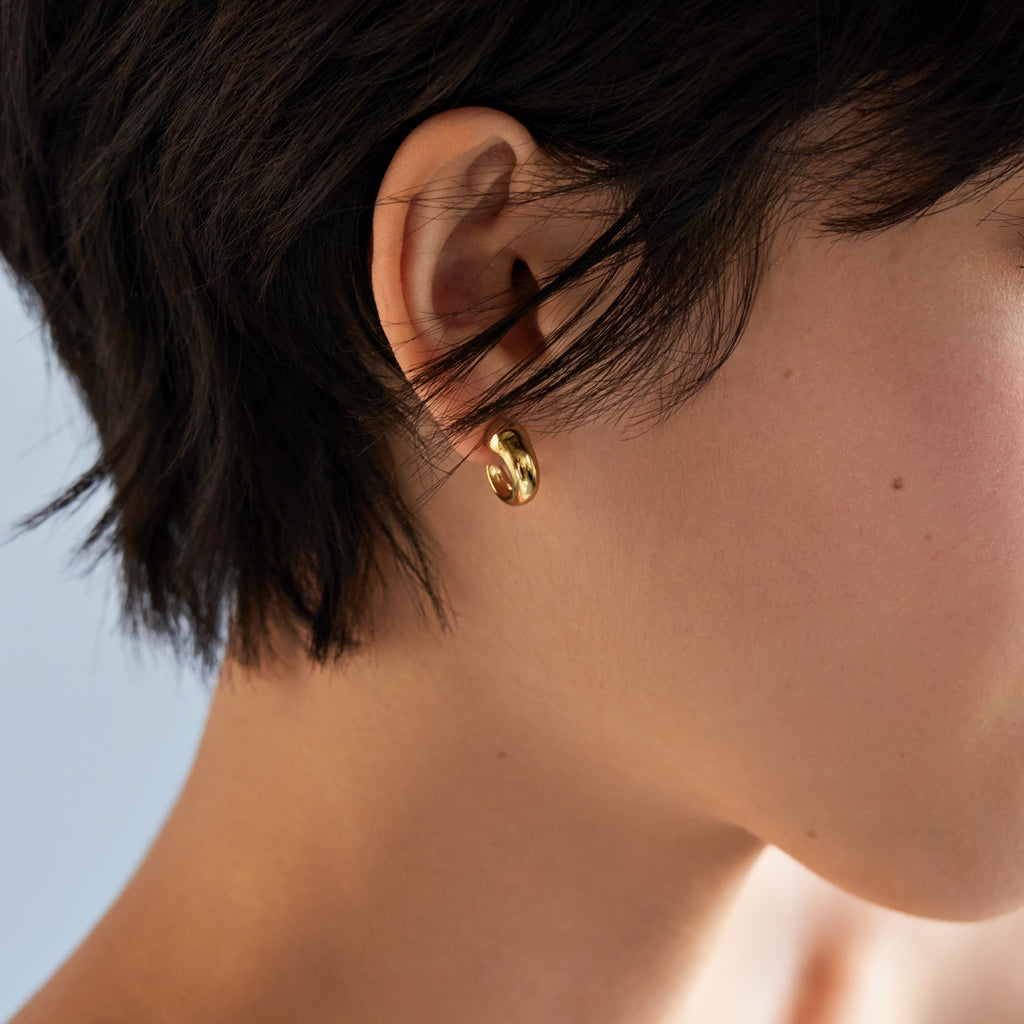 Sleek and polished, a huggie emerges from a spherical top, gently embracing the earlobe. A mini version of its larger hoop counterpart, it was crafted from the casting of a rare twin pearl, shaped so that the attached 'twin' extends to become the hoop itself. (Note: A twin pearl emerges when two distinct freshwater pearls naturally meld together during their creation.) These modern beauties are the gentle 'pop' your outfit needed. Available in 3 sizes.