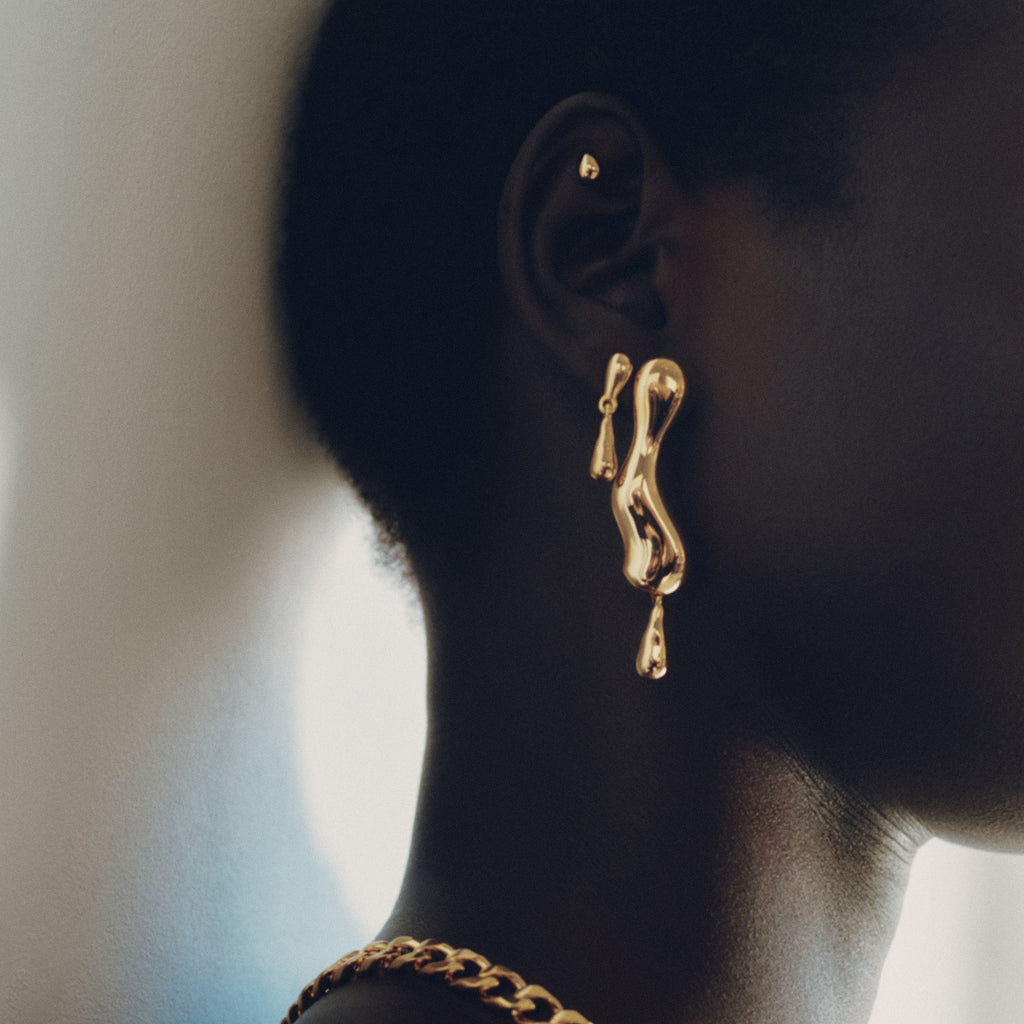 A duo of sleek, interlocked forms drip into a stream of molten fluidity. Playful yet elevated, these high-gloss beauties are sure to turn heads.