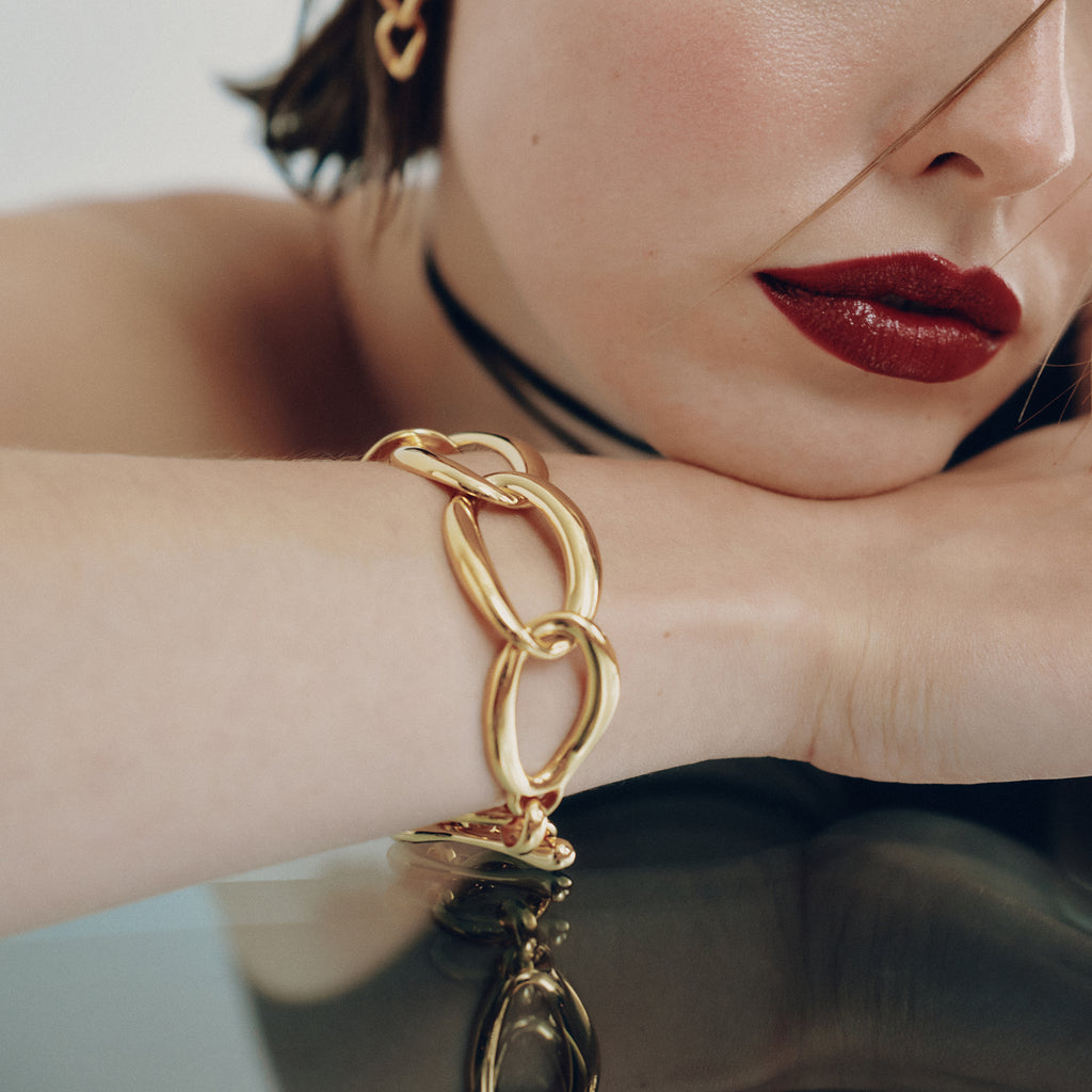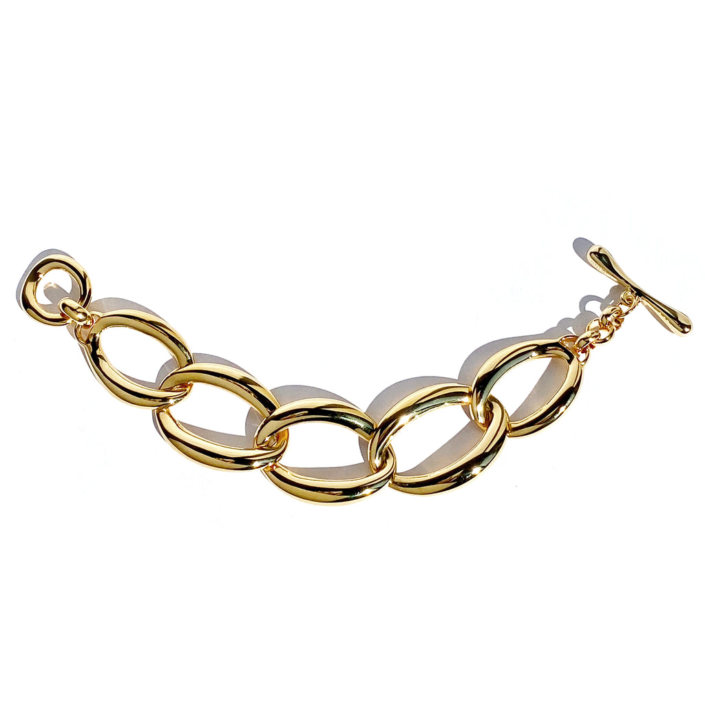 A chic oversized custom curblink bracelet to top off your daily looks. Each component is custom cast, hand-polished and assembled by hand, link-by-link. Finished with our custom wavy toggle and bar closure.
