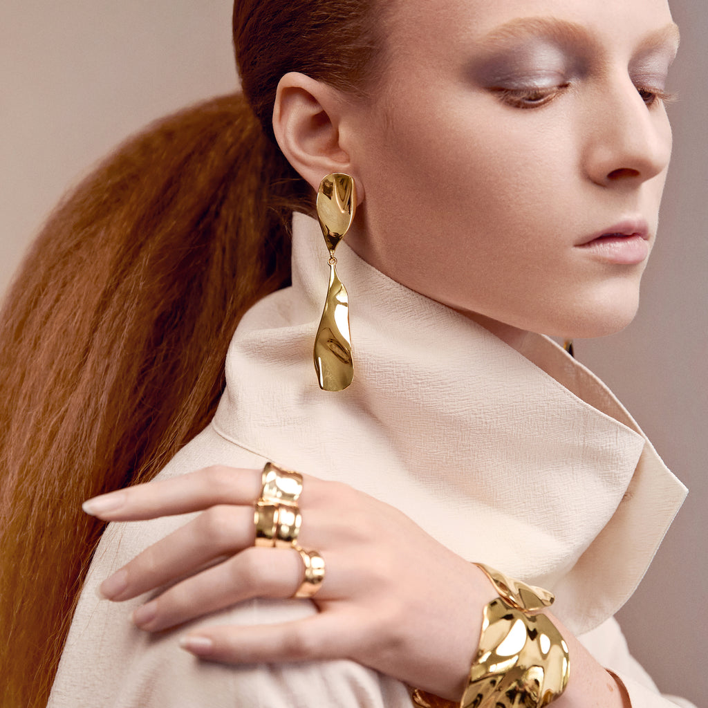 All BIKO pieces are plated in 14k gold or rhodium, over brass. They do not tarnish or cause discolouration on the skin. All earring posts are surgical stainless steel, and hypo-allergenic. Wear your BIKO jewels often; love them always.