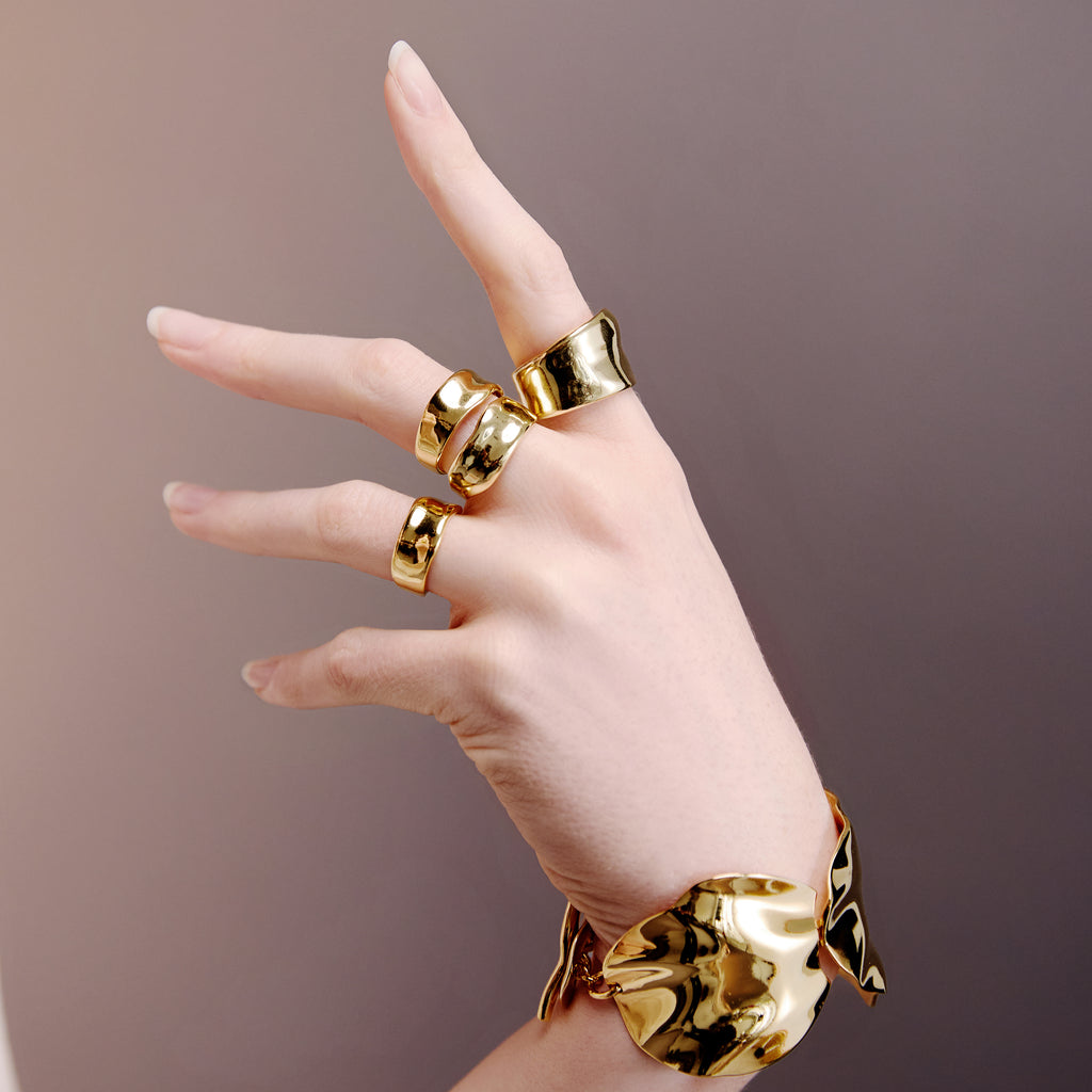 Sculptural and curvaceous, Phoebe represents an abstract flower petal contouring around the finger. This luminous band is also available in a thinner Small version.