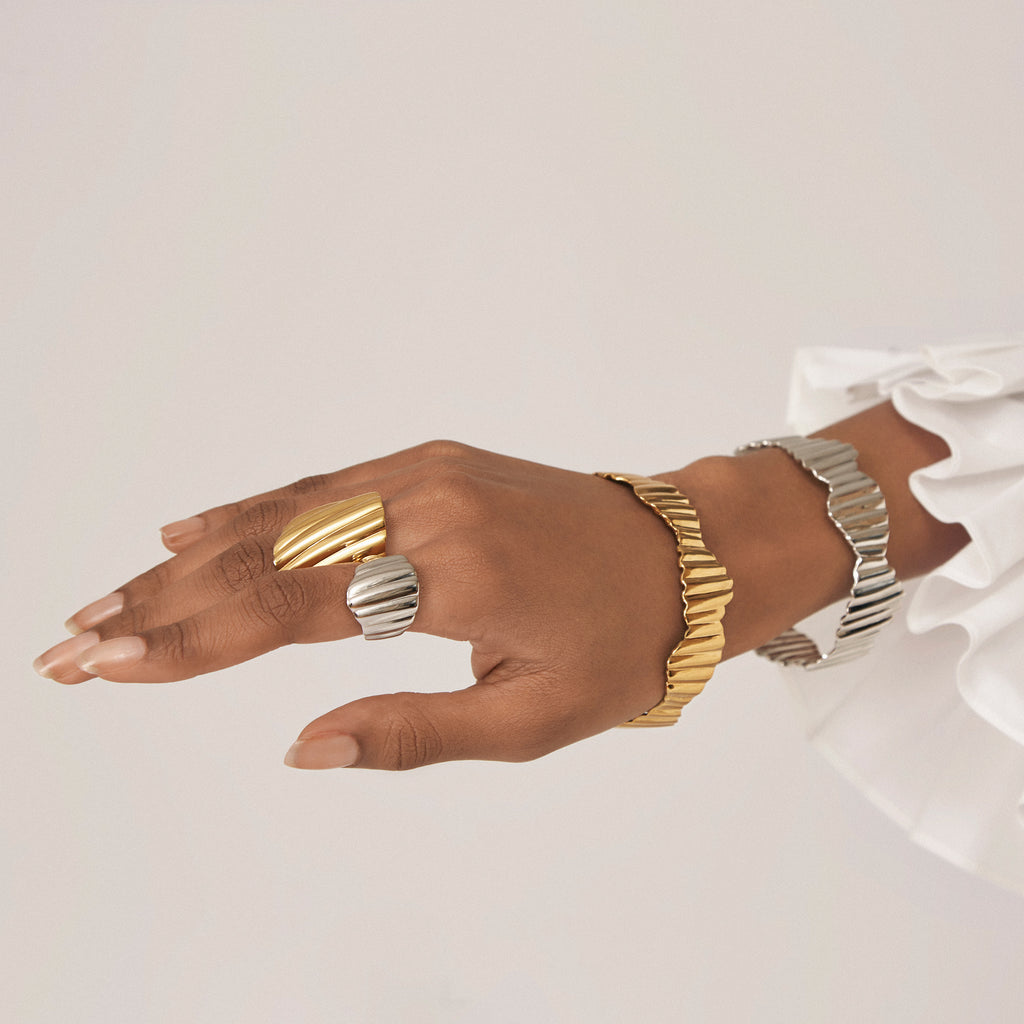 A wearable sculpture, the Sunray Bangle is thoughtfully handcrafted from deconstructed shell findings. It's organic ripples vibrate with light-bending energy and soak up the spotlight, in the most satisfying way.