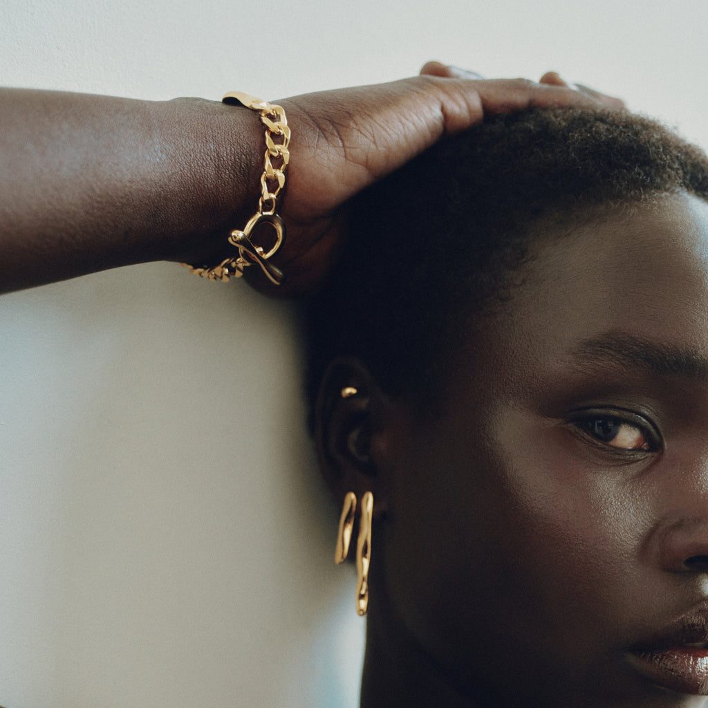 This molten curve hugs your wrist just right—modern, minimal, and effortlessly chic. The perfect balance of structure and fluidity, finished with a sleek curb chain and custom wavy toggle and bar closure. Your new go-to for every day.