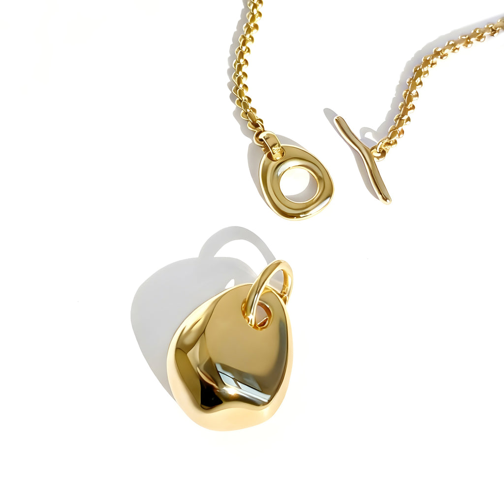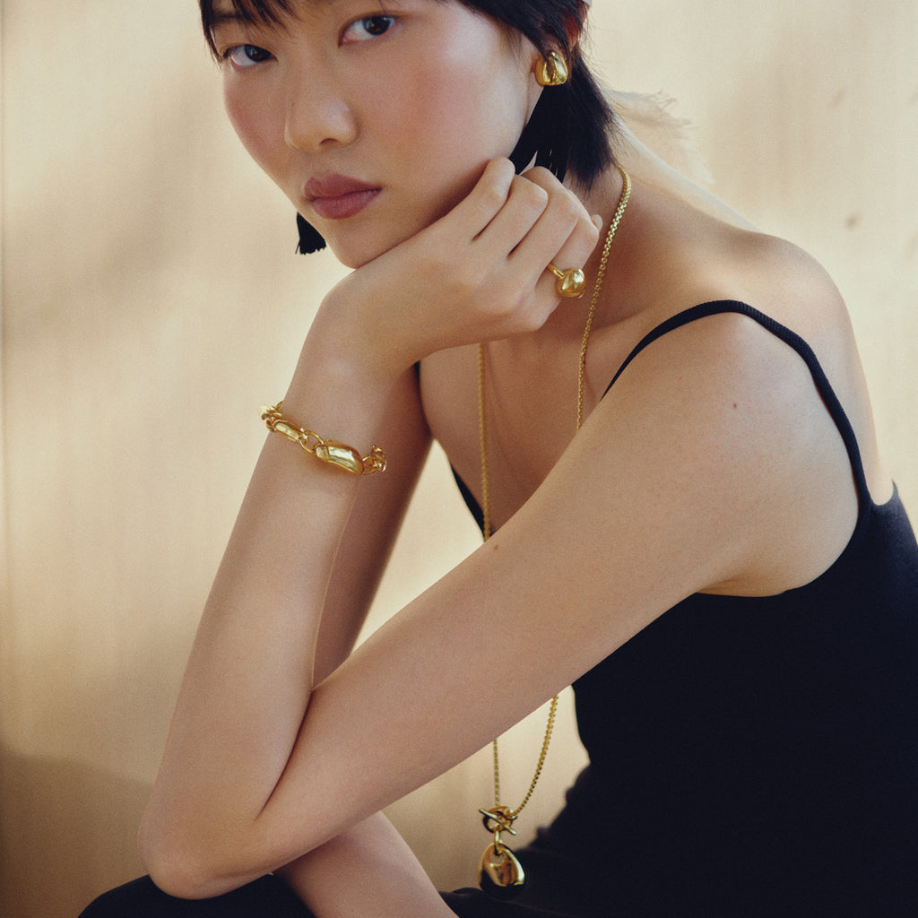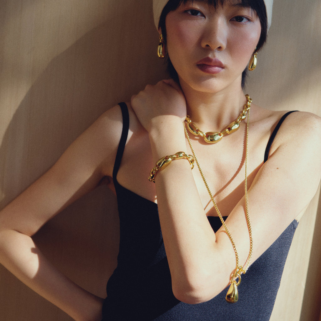 Versatility meets sculptural form. The Amlo Pendant is cast from a hand-selected pebble from the beaches of Greece, manually hollowed out for comfort, and suspended (via hidden clasp) from our vintage-sourced decorative chain with custom mini-pebble toggle & bar. Wear it long, double-wrap it, or detach the pendant for solo styling — even on a purse zipper. The chain is as striking on its own, offering endless ways to play.