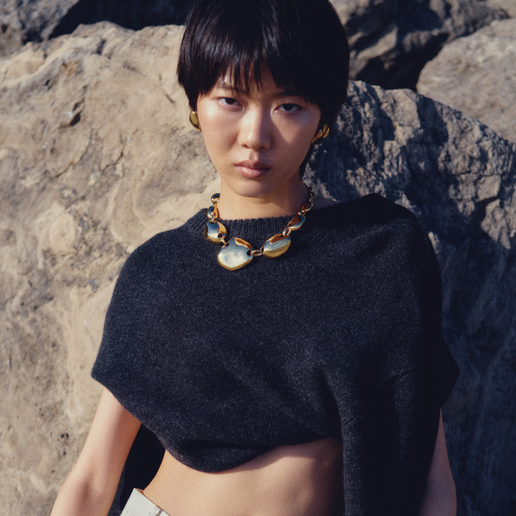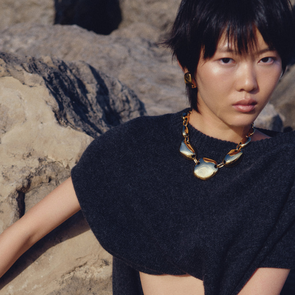 A sculptural homage to the Earth’s artful forms, the Gaia Collar is cast from pebbles collected over a lifetime of visits to Corrine’s grandmother’s beach in Bolati, Greece. Polished and assembled link by link, it balances strength with serene beauty, becoming the kind of statement piece you’ll reach for again and again. Wear it under a crisp collar for a hint of shine or let it steal the show over a turtleneck or LBD. Finished with our custom toggle and bar.