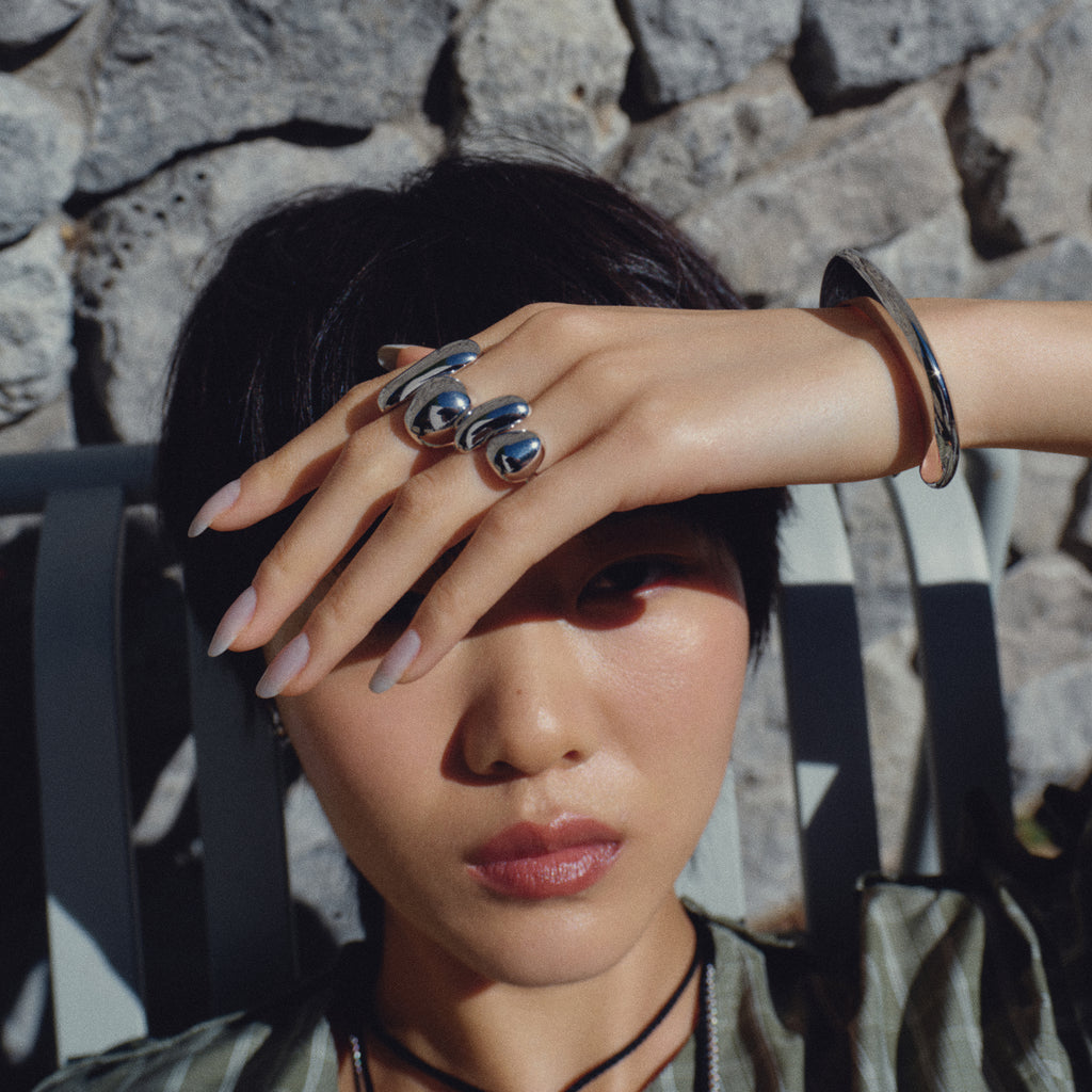 Featuring a floating duo of hand-cast pebbles, the Rafina Ring is a sleek expression of balance and form. Let it shine solo as a sculptural statement, or stack it with the Rafina Ring Small for added impact. Gently adjustable.