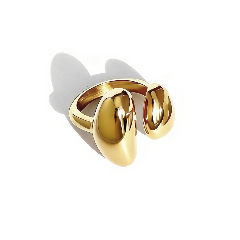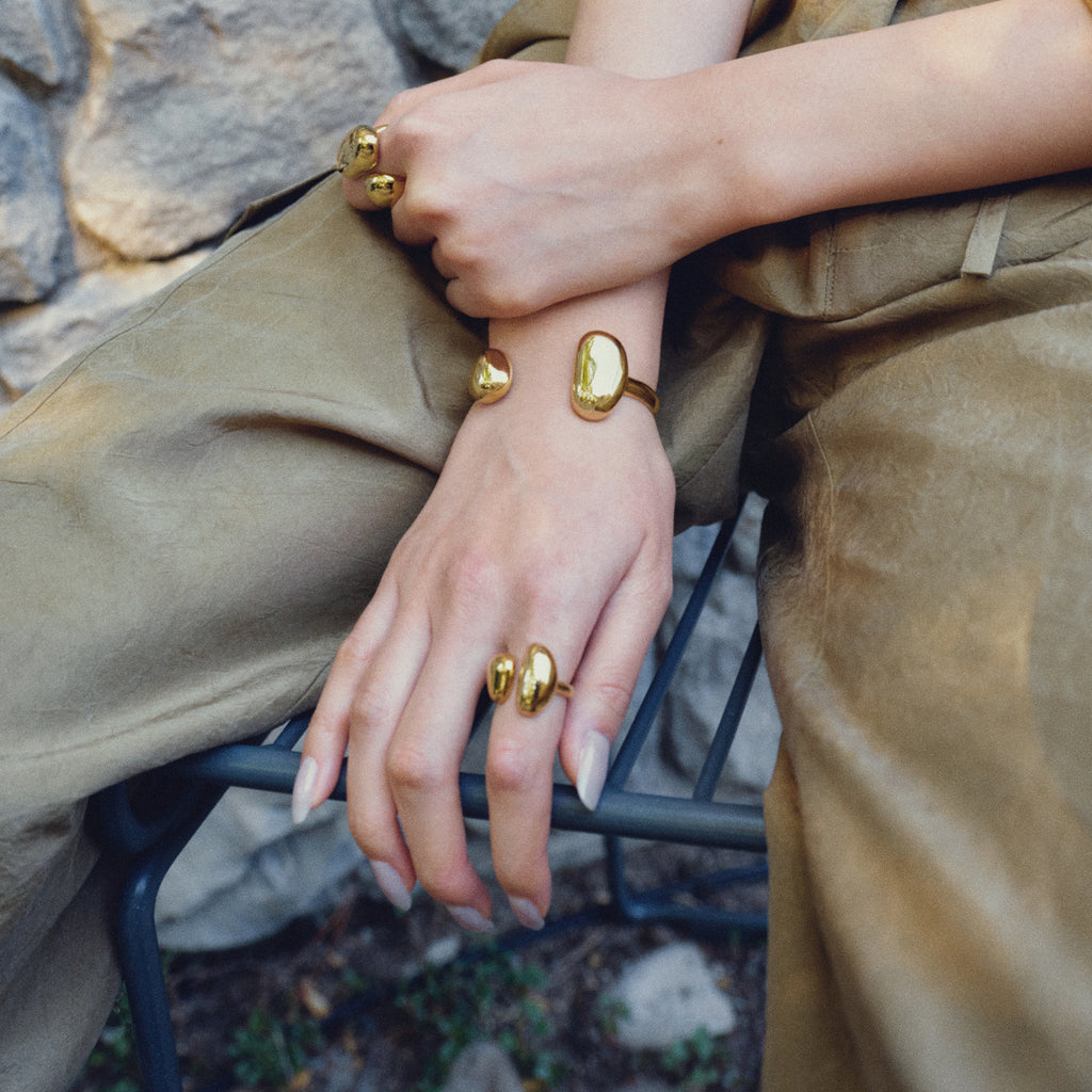 Featuring a floating duo of hand-cast pebbles collected from the beaches of Greece, the Rafina Ring is a sleek expression of balance and form. Let it shine solo as a sculptural statement or stack it with the Rafina Ring Large for added impact. Gently adjustable.