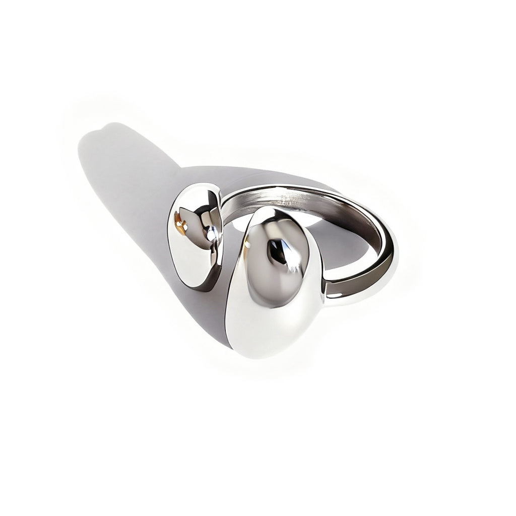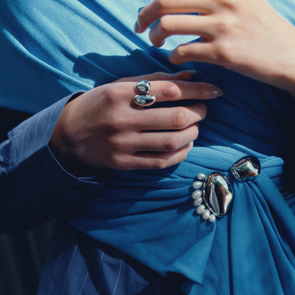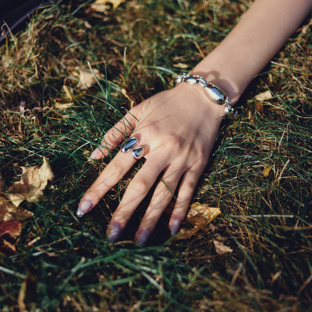 Featuring a floating duo of hand-cast pebbles collected from the beaches of Greece, the Rafina Ring is a sleek expression of balance and form. Let it shine solo as a sculptural statement or stack it with the Rafina Ring Large for added impact. Gently adjustable.